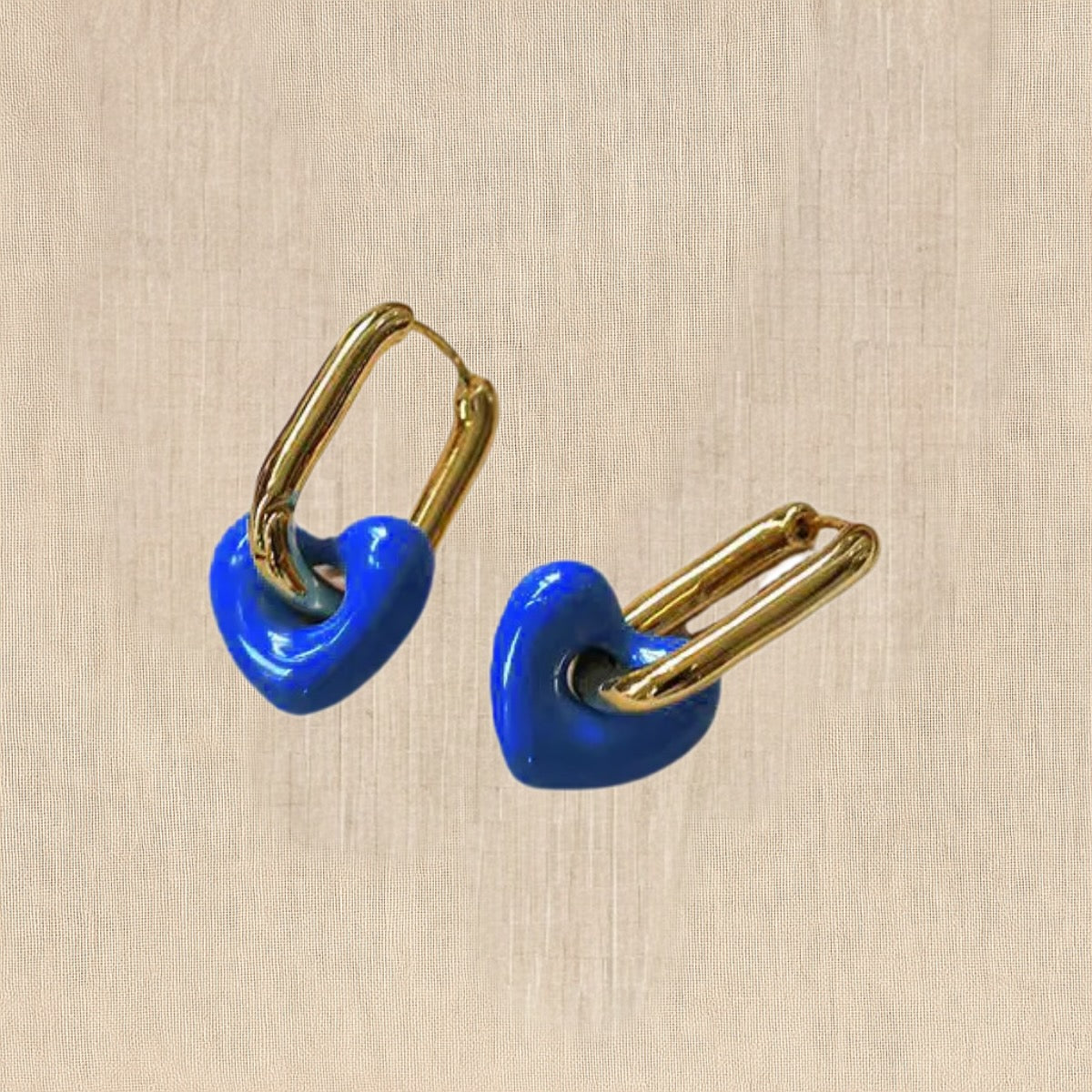 - Enamel-coated heart charms in vibrant cobalt blue.